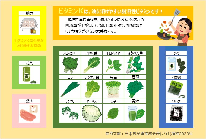 ビタミンKは、緑黄色野菜や葉物野菜、海藻類に多く含まれる植物の葉緑体からつくられるものと、納豆やチーズなどの発酵食品に多く含まれる微生物によってつくられるものがあり、腸内細菌によって人間の体内でもつくられます。納豆にはビタミンKが豊富に含まれてはいますが、納豆菌が腸内でもビタミンKをつくるので、効率的なビタミンKの吸収源となります。